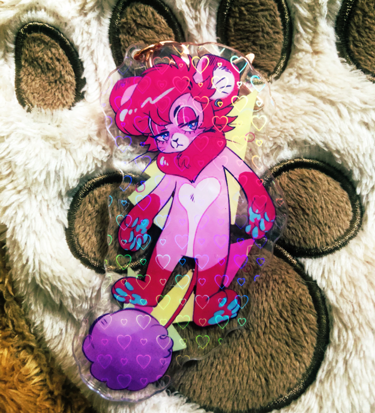 A 3 inch charm of Pepper the Lion. She features heart holo glitter and a start shaped Rose gold lobster claw.