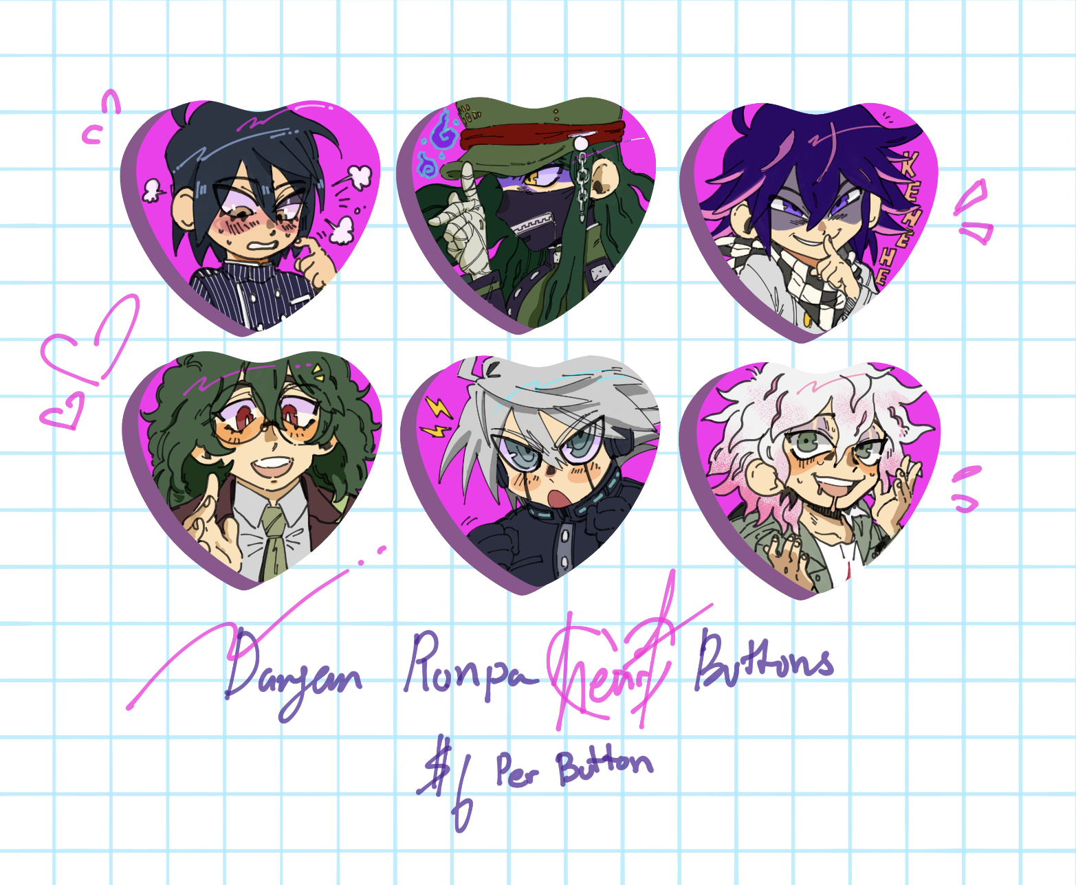 Heart shaped aluminum buttons featuring characters from DanganRonpa. Pre-orders open till end of month!